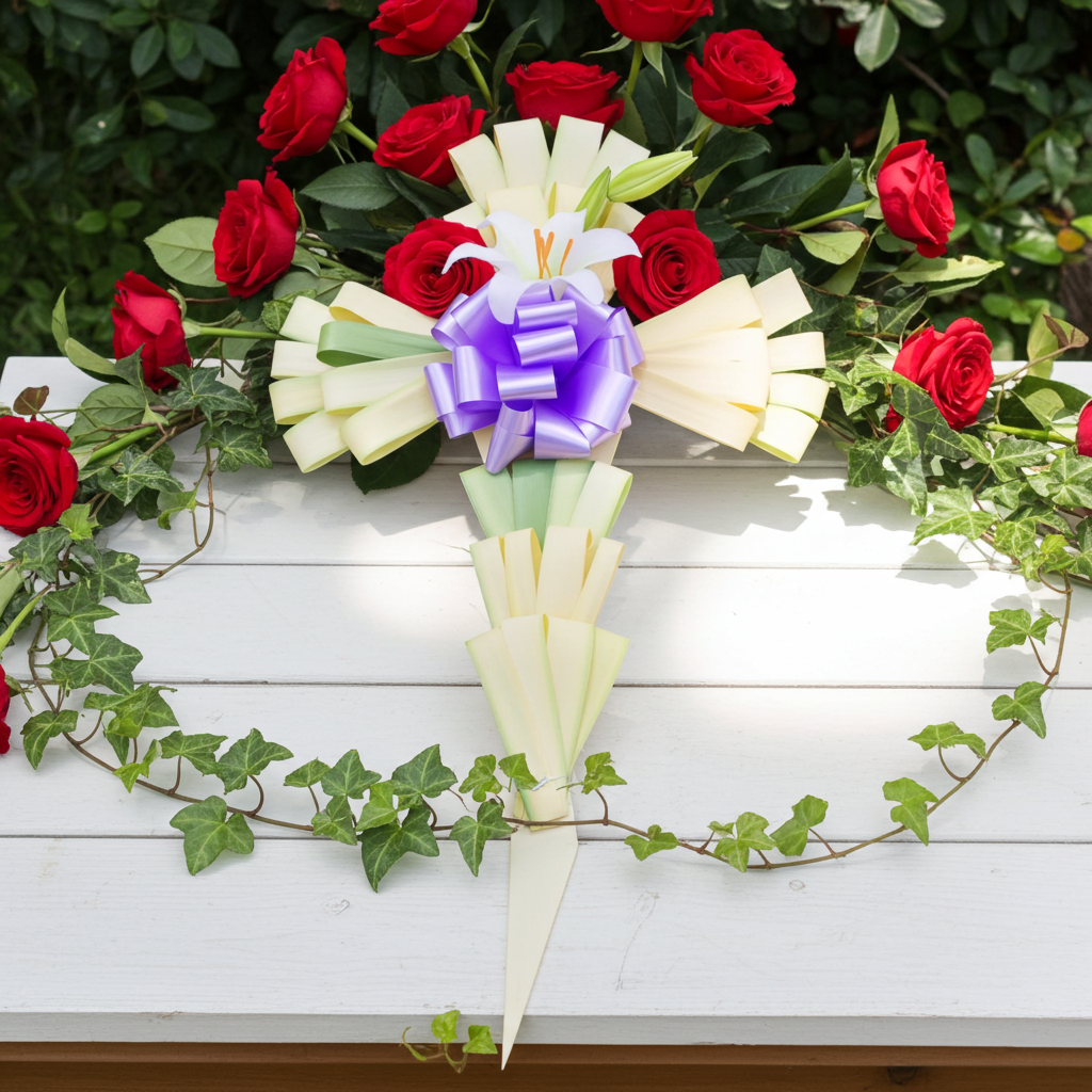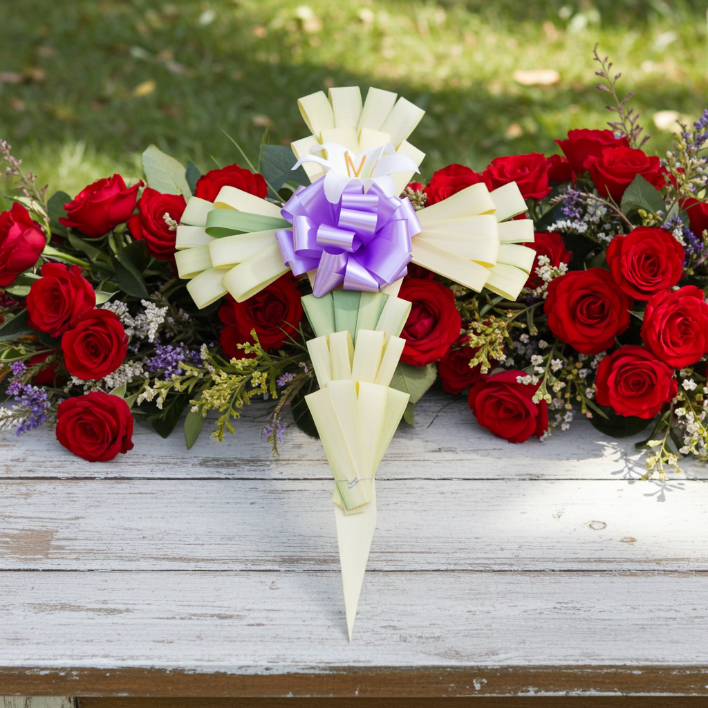Esta cruz de palma de 18'' x 6'' hecha a medida está creada por artesanos pieza por pieza y decorada con 7 juegos de abanicos de bucles de palma M-5, lirio de plástico y un lazo con el color de su elección.